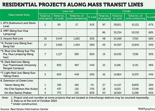 ตารางต่อไปนี้แสดงภาพรวมของโครงการคอนโดมิเนียมตามแนวรถไฟฟ้าต่างๆ