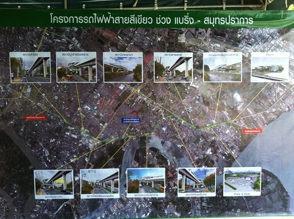 ส่วนเส้นทางรถไฟฟ้าสายสีเขียวช่วง แบริ่ง-สมุทรปราการ มีระยะทาง 13 กิโลเมตร โดยเริ่มที่สถานีสำโรง ยาวไปจนสถานีสุดท้าย คือสถานีสมุทรปราการ รวมทั้งหมด 9 สถานี