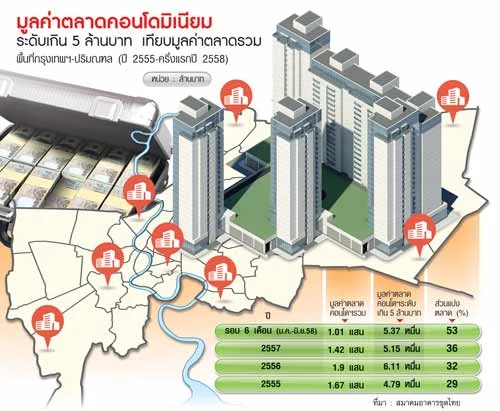 ทั้งนี้ จากการรวบรวมข้อมูลในช่วงครึ่งแรกปี 2558 พบว่า ตลาดคอนโดฯในกทม.-ปริมณฑลมีการเติบโตอย่างมากคิดเป็นอัตราการเติบโตถึง 72% เมื่อเทียบกับช่วงเวลาเดียวกันของปี 2557 คิดเป็นมูลค่าตลาดรวม 1.01 แสนล้านบาท โดยเฉพาะในกลุ่มระดับราคามากกว่า 5 ล้านบาท ที่มีการเปิดตัวอย่างมากกินส่วนแบ่งตลาดสูงถึง 54% ของตลาดรวม คาดการณ์ว่าในครึ่งปีหลังตลาดคอนโดฯจะชะลอตัวลง แต่อย่างไรก็ตามยังเชื่อว่าตลาดคอนโดฯโดยภาพรวมจะมีอัตราการเติบโตอยู่ที่ประมาณ 27% หรือคิดเป็นมูลค่าตลาดรวมที่ประมาณ 1.8 แสนล้านบาท ซึ่งเป็นอัตราการเติบโตที่ได้รับอานิสงส์มาจากครึ่งแรกปี 2558