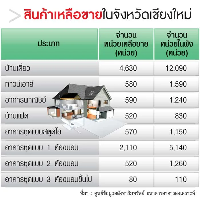 จากการสำรวจโครงการที่อยู่อาศัยที่อยู่ระหว่างการขาย เฉพาะโครงการที่มีหน่วยเหลือขายไม่ต่ำกว่า 6 หน่วย ในจังหวัดเชียงใหม่ โดยศูนย์ข้อมูลอสังหาริมทรัพย์ประจำปี 2558 พบว่า มีโครงการบ้านจัดสรรซึ่งอยู่ระหว่างการขาย 159 โครงการ มีหน่วยในผังโครงการรวมกันประมาณ 17,300 หน่วย เหลือขายประมาณ 7,050 หน่วย (เทียบกับปี 2557 มี 145 โครงการ หน่วยในผัง 14,900 หน่วย เหลือขายประมาณ 6,200 หน่วย) เมื่อแบ่งตามประเภท พบว่า เป็นประเภทบ้านเดี่ยวมากที่สุดคือ 70% ของหน่วยบ้านจัดสรรทั้งหมด
