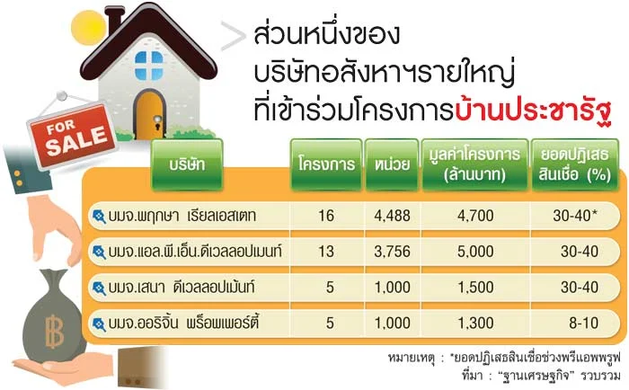 โครงการบ้านประชารัฐส่อแววเดี้ยง เอกชนประสานเสียงยอดปฏิเสธสินเชื่อพุ่ง “พฤกษา”ชี้ปัญหาหนี้สินครัวเรือนยังหลอน แอล.พี.เอ็น.เผยลูกค้ากลุ่มลูกจ้างยอดปฏิเสธสินเชื่อ100% “เสนา”แนะปรับเกณฑ์ยื่นกู้ หวังขยายกลุ่มลูกค้า ด้าน 2 แบงก์รัฐส้มหล่นหนุนสินเชื่อบ้านขยายตัว ธ.ออมสินเสนอคลังแก้เกณฑ์ยื่นกู้บ้านประชารัฐ ฟากธอส.พร้อมเสนอผลิตภัณฑ์บ้านทางเลือกหากคุณสมบัติไม่เข้าเกณฑ์