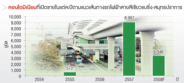 การก่อสร้างรถไฟฟ้าส่วนต่อขยายจากแบริ่งไปยังสถานีสุดท้ายที่สถานีเคหะสมุทรปราการเริ่มเป็นรูปเป็นร่างมากขึ้น โดยเส้นทางนี้มีกำหนดแล้วเสร็จในปี 2561 ซึ่งการก่อสร้างยิ่งคืบหน้ายิ่งส่งผลให้ตลาดคอนโดมิเนียมในพื้นที่ตลอดแนวเส้นทางการก่อสร้างมีการขยายตัวค่อนข้างมาก โดยเฉพาะในปี 2557 ที่มีโครงการคอนโดมิเนียมเปิดขายถึง 8,997 ยูนิตจากทั้งหมด 7 โครงการ (แต่มี 1 โครงการที่มีจำนวนมากกว่า 5,000 ยูนิต) ถือเป็นปีที่มีโครงการคอนโดมิเนียมเปิดขายมากที่สุด และมีอัตราการขายมากกว่า 50% โดยเฉพาะในโครงการที่อยู่ใกล้กับสถานีสำคัญ เช่น สถานีศาลากลางจังหวัดสมุทรปราการ และปู่เจ้าสมิงพราย เป็นต้น