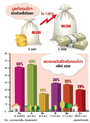 ผู้สื่อข่าวรายงานว่า สถานการณ์อสังหาริมทรัพย์ครึ่งปีแรกมีโครงการแนวสูงเปิดตัวใหม่ มูลค่ารวม 107,246 ล้านบาท เทียบกับช่วงเดียวกันปีก่อน มีมูลค่า 46,535 ล้านบาท เติบโต 130% โดยอัตราเติบโตสูงผิดปกติเกิดจากการพัฒนาโครงการเกรดเอ ระดับราคา 5 ล้านบาท/ยูนิตขึ้นไป มากกว่า 20 โครงการ อาทิ เดอะ ดิโพลแมท 39, แอชตัน จุฬา-สีลม, พาร์ค 24, คลาส สยาม, โนเบิล บี 33 กับห้องชุด 3-5 ล้านบาท 8 โครงการ อาทิ แชปเตอร์วัน มิดทาวน์ ลาดพร้าว 24, วิสซ์ดอม คอนเนค สุขุมวิท, เดอะ ไลน์ จตุจักร-หมอชิตมีผลให้สัดส่วนคอนโดฯมีการเปลี่ยนแปลง โดยห้องชุดเกรดเอ เอบวก ราคา 3 ล้านบาทขึ้นไป เพิ่มเป็น 33% ของทั้งตลาด จากเดิมปี 2554-2557 อยู่ที่ 14-25% นอกจากนี้ ยอดขายเปิดตัววันแรกของคอนโดฯเกรดเอบวก 60% เกรดเอ 3-5 ล้านบาท/ยูนิต 63% ถือว่าขายดี เทียบกับคอนโดฯราคาต่ำกว่า 3 ล้านบาท ที่มียอดขาย 24-38%