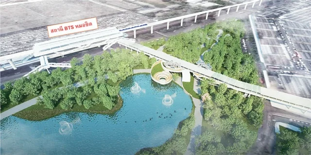 ซึ่งพื้นที่พัฒนาเป็นบริเวณทางเดินลอยฟ้า (Sky Walk) เชื่อมระหว่างสถานีกลางบางซื่อ สถานีรถไฟฟ้าใต้ดินจตุจักร และบีทีเอสหมอชิต ระยะทางรวม 1.3 กิโลเมตร จะสร้างพาดผ่านสวนจตุจักรโดยสร้างตอม่อบริเวณพื้นที่ถนนใกล้กับสวนสาธารณะ และปรับทัศนียภาพบริเวณตอม่อเป็นทางขึ้น-ลงเพื่อเป็นจุดชมวิวคล้ายส่วนบาบิโลน และบริเวณทางเชื่อมระดับดินจากสถานีกลางบางซื่อไปยังสถานีย่อย บขส.ประมาณ 1.4 กิโลเมตร ซึ่งทางเดินเชื่อมนี้จะใช้เงินลงทุนประมาณ 1,000 ล้านบาท