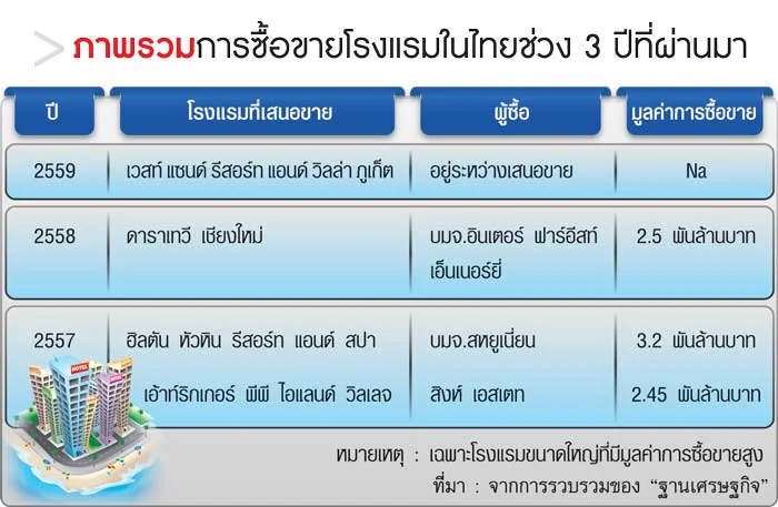 เนื่องจากประเทศไทยมีเสถียรภาพมากขึ้นและภาคธุรกิจโรงแรมมีแนวโน้มดี จึงเป็นช่วงเวลาที่เหมาะสมที่จะเข้ามาลงทุน สำหรับมูลค่าการซื้อขายโรงแรมในไทย โดยทั่วไปจะอยู่ที่ประมาณ หมื่นล้านบาทต่อปี แต่ในปี2557 มูลค่าการซื้อขายอยู่ที่ 1.4 หมื่นล้านบาท อันเป็นผลมาจากการที่ปี 2557 มีการซื้อขายโรงแรมรายการใหญ่เกิด คือโรงแรม ฮิลตัน หัวหิน ซึ่งมีมูลค่าสูง ทำให้ปีนั้นมูลค่าการซื้อขายโรงแรมสูงเป็นพิเศษ