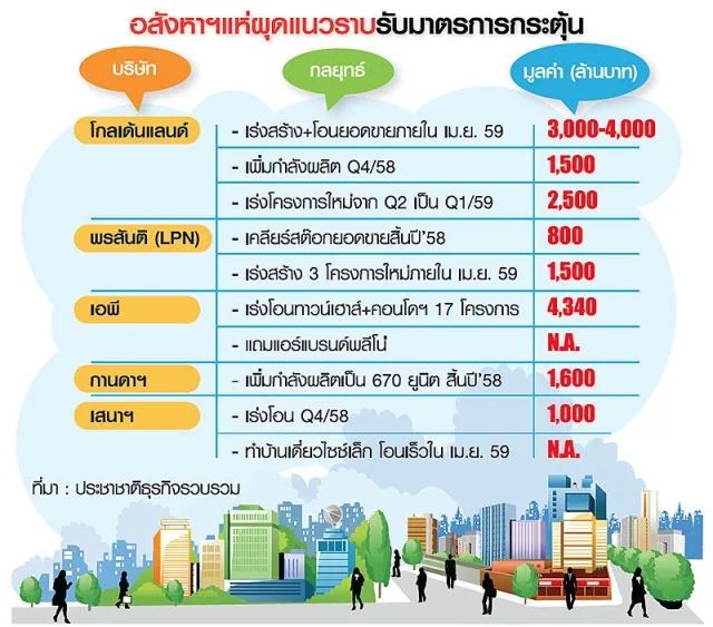 ผู้ประกอบการขานรับมาตรการกระตุ้นอสังหาฯ "โกลเด้นแลนด์-เอพี-แอล.พี.เอ็น.-เสนาฯ-กานดา" เร่งสปีดก่อสร้าง-ขายภายใน 6 เดือน ร่นเวลาส่งมอบไตรมาสแรก ปี 2559 รัฐบาลดึง 17 ดีเวลอปเปอร์ร่วมพัฒนาที่ดินราชพัสดุ ธนารักษ์ ทำโปรเจ็กต์บ้านคนจน "กสิกรฯ-กรุงไทย"เมินแข่ง ธอส.