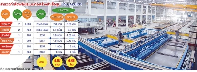 จากการสำรวจบริษัทอสังหาริมทรัพย์ที่มีโรงงานพรีแฟบในเครือซึ่งเป็นผนังคอนกรีตสำเร็จรูปทำให้การก่อสร้างที่อยู่อาศัยรวดเร็วกว่าการก่ออิฐฉาบปูนและผลิตได้จำนวนมาก ตรงตามความต้องการพัฒนาบ้านคนจนของรัฐบาล พบว่า 6 ราย กำลังผลิตรวมกัน 4.88 ล้าน ตร.ม./ปี