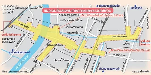 ส่วนสิ่งปลูกสร้างจะได้รับผลกระทบมี 492 หลัง แบ่งเป็นสิ่งปลูกสร้างของรัฐ 87 หลัง สิ่งปลูกสร้างเอกชน 405 หลัง มีหลายหลังที่อยู่ในที่ดินเจ้าของเดียวกัน เช่น บจ. บ้านฉัตรเพชร เป็นอาคารร้างและอาคารไม้ชั่วคราว 12 หลัง, ร้านหัวปลาช่องนนทรี, สนามฟุตซอลริมน้ำ, ตึกหลิ่มกิ๋มเล่ง, ที่จอดรถ หจก.ไซ-ซาย, ที่เก็บวัสดุสำนักงานเขตดุสิต, พิพิธภัณฑ์เด็กกรุงเทพมหานคร ร้านค้าสวัสดิการกรมการอุตสาหกรรมทหาร, ที่พักทหาร, แฟลตทหาร, กรมการอุตสาหกรรมทหาร, ร้านอาหารคุ้มเรือนแก้ว, ครัวริมไทร, โรงเรียนทหารขนส่ง, บ้านพักข้าราชการ อท.ศอพท., แฟลตอาคารทหาร, สวัสดิการร้านค้าโรงเรียนโยธินบูรณะ, โรงเรียนโยธินบูรณะ, ธนาคารออมสิน (แยกสะพานดำ), ปั๊ม ปตท., สหกรณ์ออมทรัพย์, สุรพันธ์คลีนิค, ที่ทำการตรวจรถไฟบางซื่อ, เพิงขายต้นไม้ชั่วคราวบริเวณจตุจักร เป็นต้น