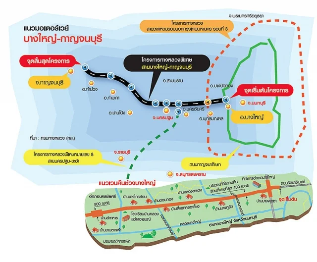 แหล่งข่าวจากกรมทางหลวง (ทล.) กระทรวงคมนาคม เปิดเผย “ประชาชาติธุรกิจ” ว่า ขณะนี้กรมได้ปรับแผนการก่อสร้างมอเตอร์เวย์สายบางใหญ่-กาญจนบุรี ระยะทาง 96 กม. ให้สอดรับกับการเวนคืนที่ดิน เนื่องจากปี 2559 ได้รับงบประมาณสำหรับจ่ายค่าเวนคืนที่ดิน 500 ล้านบาท อยู่ระหว่างของบฯกลางเพิ่ม 1,000 ล้านบาท แต่ก็ยังไม่เพียงพอเวนคืนทั้งโครงการที่จะต้องใช้เงิน 5,420 ล้านบาท เนื่องจากเป็นการเปิดแนวก่อสร้างบนพื้นที่ใหม่ จึงต้องรองบประมาณปี 2560 จำนวน 3,920 ล้านบาท เพื่อจ่ายค่าเวนคืนส่วนที่เหลือ
