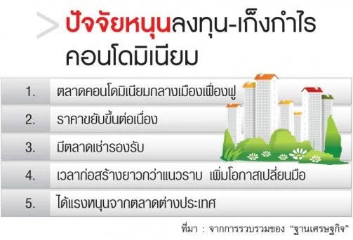 กระแสการลงทุนหรือเก็งกำไรในตลาดคอนโดมิเนียมดังที่กล่าวมานั้น มีแรงหนุน จาก 5 ปัจจัยหลัก (ดูตารางประกอบ) โดยในช่วง 7-8 ปี ที่ผ่านมา ตลาดคอนโดมิเนียมแนวรถไฟฟ้ากลางเมือง และส่วนต่อขยายเติบโตอย่างน่าตื่นใจ โดยปี 2551 คอนโดมิเนียมเข้าตลาด 15,000 หน่วย ก่อนเพิ่มเป็น 50,000 หน่วยต่อปีโดยเฉลี่ยในปัจจุบัน การเติบโตของตลาดทำให้ราคาคอนโดมิเนียมขยับขึ้นอย่างต่อเนื่อง มีตลาดเช่ารองรับโดยเฉพาะตลาดต่างชาติ เช่น ตลาดเช่าเริ่มขยายจากย่านสุขุมวิทเข้าไปสู่ย่านอ่อนนุช ทำให้ราคาเช่าบริเวณดังกล่าวปรับสูงขึ้น 13 % ( ทีมา: พลัส พร็อพเพอร์ตี้) 4.การก่อสร้างคอนโดมิเนียมที่ระยะเวลาก่อสร้างต้องใช้เวลา 2 ปีโดยเฉลี่ย ทำให้มีช่วงเวลาเปลี่ยนมือ (ขายใบจอง หรือ ขายดาวน์) ง่ายกว่าอสังหาริมทรัพย์แนวราบ