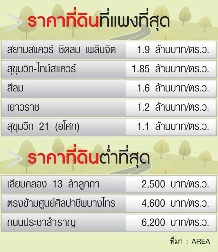 ศูนย์ข้อมูลวิจัยและประเมินค่าอสังหาริมทรัพย์ไทย หรือ AREA ได้เปิดเผยผลการสำรวจราคาที่ดินล่าสุดในเขตกรุงเทพมหานครและปริมณฑล พบว่า ที่ดินที่มีราคาแพงที่สุดในขณะนี้คือ บริเวณสยามสแควร์ ชิดลม เพลินจิต (ราคา 1.9 ล้านบาทต่อตร.ว. หรือ 760 ล้านบาทต่อไร่) สำหรับที่ดินขนาด 4 ไร่ เนื่องจากมีรถไฟฟ้า 2 สายวิ่งตัดกัน ส่งผลให้กลายเป็นศูนย์กลางธุรกิจที่ขยายตัวสูงสุดโดยเฉพาะธุรกิจค้าปลีก แซงหน้าสีลมและเยาวราชที่เคยแพงที่สุด โดยบริเวณสุขุมวิท-ไทม์สแควร์ ราคารองลงมาคือ 1.85 ล้านบาทต่อตร.ว. (740 ล้านบาทต่อไร่) ในส่วนของพื้นที่สีลมราคาที่ดินอยู่ที่ 1.6 ล้านบาทต่อตร.ว. (640 ล้านบาทต่อไร่) เพราะมีรถไฟฟ้าวิ่งผ่านเพียงสายเดียว ส่วนเยาวราช มีราคา 1.2 ล้านบาทต่อตร.ว. (480 ล้านบาทต่อไร่) เพราะยังไม่มีรถไฟฟ้า แต่ในอนาคตเมื่อรถไฟฟ้าผ่านเจริญกรุงเสร็จ ราคาที่ดินคงจะพุ่งขึ้นอีกมาก ในขณะที่ช่วงกลาง ๆ ของถนนสุขุมวิท 21 (อโศก) ราคา 1.1 ล้านบาทต่อตร.ว. (440 ล้านบาทต่อไร่) ต่ำกว่าแถวไทม์สแคร์ที่อยู่ห่างกันไม่มากนัก เนื่องจากมีรถไฟฟ้าใต้ดินผ่านเพียงสายเดียว