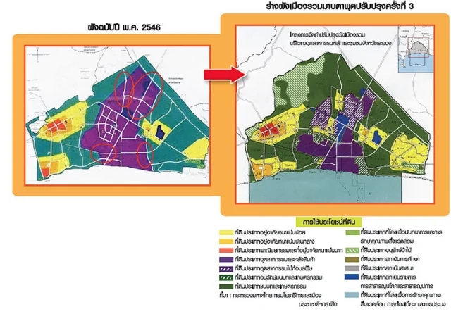 เปิดพิมพ์เขียวผังเมืองรวมมาบตาพุด 2.5 แสนไร่ กำหนดใช้ประโยชน์ที่ดิน 13 ประเภท ปรับลดพื้นที่อุตฯ 1.7 หมื่นไร่ ควบคุมแหล่งกำเนิดมลพิษ เพิ่มพื้นที่สีเขียว-ที่อยู่อาศัย รองรับการพัฒนาเมืองอุตสาหกรรมเชิงนิเวศ กรมโยธาฯโยนเผือกร้อนให้ท้องถิ่นตัดสินใจเพิ่มพื้นที่สีม่วง สนองนโยบาย "รัฐบาลตู่ 3" บูมซูเปอร์คลัสเตอร์ย่านอีสเทิร์นซีบอร์ด