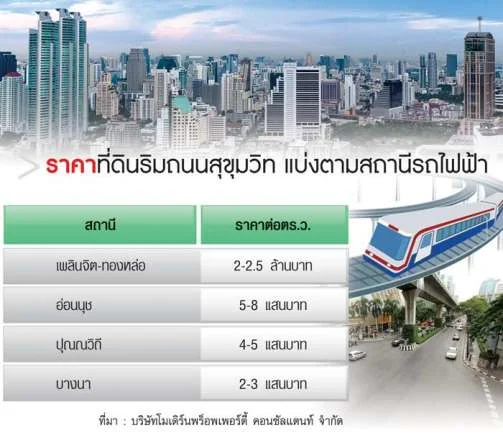 ด้าน นายวสันต์ คงจันทร์ กรรมการผู้จัดการ บริษัท โมเดิร์นพร็อพเพอร์ตี้ คอนซัลแตนท์ จำกัด กล่าวถึงราคาที่ดินตามเส้นทางถนนสุขุมวิทว่า ราคาที่ดินบริเวณต้นถนนสุขุมวิทหรือนับตั้งแต่สถานีรถไฟฟ้าเพลินจิต-ทองหล่อ ราคาที่ดินบริเวณริมถนนอยู่ที่ประมาณ 2-2.5 ล้านบาทต่อตร.ว. แต่ถ้าเป็นที่ดินในซอยที่มีขนาดถนนกว้างไม่ถึง 10 เมตร สามารถสร้างอาคารสูงได้ไม่เกิน 8 ชั้น ราคาที่ดินอยู่ที่ประมาณ 5 แสน-1.5 ล้านบาทต่อตร.ว. ขณะที่ในซอยเดียวกันแต่มีขนาดถนนกว้างกว่า 10 เมตร ซึ่งสามารถสร้างอาคารสูงได้ ราคาขายที่ดินอยู่ที่กว่า 1 ล้านบาทต่อตร.ว.ทำให้ที่อยู่อาศัยในบริเวณนี้ส่วนใหญ่เป็นคอนโดมิเนียม เนื่องจากที่ดินมีราคาสูงสำหรับราคาที่ดินนับตั้งแต่ช่วงอ่อนนุช-แบริ่งราคาที่ดินริมถนนอยู่ที่ประมาณ 2-8 แสนบาทต่อตร.ว. โดยพื้นที่ที่มีความคึกคักของที่อยู่อาศัยคือช่วงสี่แยกบางนา เนื่องจากมีศูนย์การค้าขนาดใหญ่และมีการขยายตัวของสิ่งอำนวยความสะดวกต่างๆ ประกอบกับราคาที่ดินยังสามารถนำมาพัฒนาโครงการในระดับราคาขายต่ำกว่า 1.5 แสนบาทต่อตร.ม.ได้