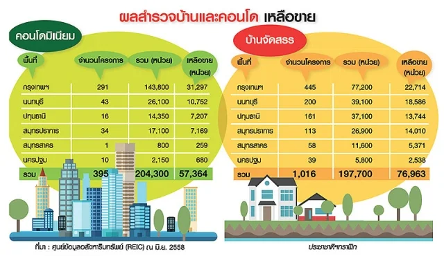 นายสัมมา คีตสิน ผู้อำนวยการศูนย์ข้อมูลอสังหาริมทรัพย์ ธนาคารอาคารสงเคราะห์ (ธอส.) หรือ REIC เปิดเผยว่า ผลสำรวจที่อยู่อาศัยในเขตกรุงเทพฯและปริมณฑลช่วงครึ่งปี 2558 แยกเป็นโครงการแนวราบ 1.98 แสนหน่วย มูลค่า 8.14 แสนล้านบาท และโครงการแนวสูง 2.04 แสนหน่วย มูลค่า 5.97 แสนล้านบาท ซึ่งอสังหาฯใน กทม. คิดเป็น 60% ของตลาดทั้งประเทศ