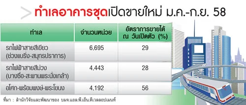 จากการสํารวจตลาดคอนโดมิเนียมประจำไตรมาสที่ 3/2558 (ม.ค.-ก.ย.) โดยสำนักวิจัยและพัฒนาของบริษัท แอล.พี.เอ็น.ดีเวลลอปเมนท์ จำกัด (มหาชน) พบว่า ทําเลที่มีการเปิดตัวโครงการคอนโดมิเนียมใหม่มากที่สุดคือ ทำเลรถไฟฟ้าสายสีเขียว (ช่วงแบริ่ง-สมุทรปราการ) มีการเปิดตัวใหม่สูงสุดถึง 15% จาก 5 โครงการ จำนวน 6,695 หน่วย รองลงมาเป็นทําเลรถไฟฟ้าสายสีม่วง (บางซื่อ-สะพานพระนั่งเกล้า) มี 4 โครงการ คิดเป็นสัดส่วน 10% จำนวน 4,443 หน่วย และอันดับ 3 ทําเลอโศก พร้อมพงษ์ พระโขนง จำนวน 12 โครงการ 4,192 หน่วย คิดเป็นสัดส่วน 10%