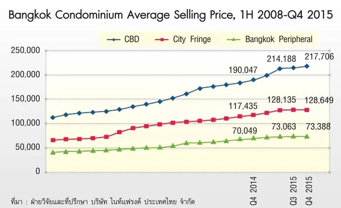 ทั้งนี้ โครงการเปิดตัวใหม่ส่วนใหญ่ตั้งอยู่ในเขตชานเมือง (peripheral area) พื้นที่รอบนอกศูนย์กลางธุรกิจ (fringe area) คิดเป็นสัดส่วน 21% และในย่านศูนย์กลางธุรกิจ 6% ของจำนวนโครงการรวมในกรุงเทพฯในไตรมาส 4/2558 ตามลำดับ การลดลงของโครงการใหม่ในย่านศูนย์กลางธุรกิจมีสาเหตุมาจากขาดแคลนที่ดินต่อการพัฒนาโครงการ ในส่วนของระดับราคา พบว่า ในพื้นที่เขตรอบนอกศูนย์กลางธุรกิจ และพื้นที่เขตชานเมืองมีระดับราคาเพิ่มขึ้นเล็กน้อยอยู่ที่ 0.4% เทียบไตรมาสต่อไตรมาส ทั้งนี้ หากดูข้อมูลแบบปีต่อปีจะเห็นว่าพื้นที่ย่านศูนย์กลางธุรกิจมีการเพิ่มขึ้น 14.6% พื้นที่เขตรอบนอกศูนย์กลางธุรกิจ เพิ่มขึ้น 9.5% และพื้นที่เขตชานเมืองเพิ่มขึ้น 4.8% จากปีก่อน