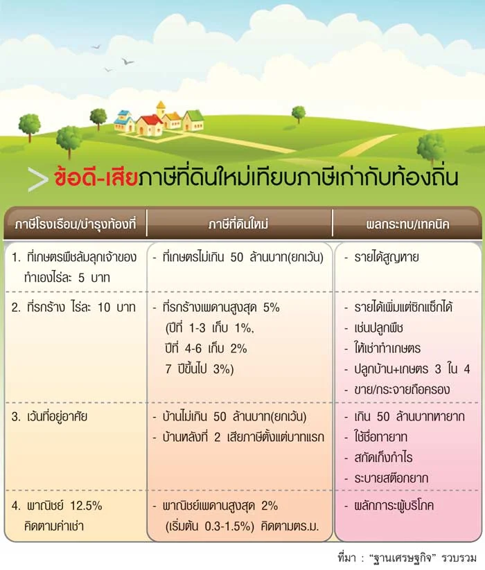 สำหรับกฎหมายที่ดินฯเชื่อว่ากว่า 90% จะหลุดการจัดเก็บจากภาษีตัวใหม่ เพราะต่างจังหวัดพื้นที่ส่วนใหญ่เป็นเกษตรกรรมแต่ละแปลงเกิน50ล้านบาท ยอมรับว่าไม่น่าจะมีเลยรวมทั้ง บ้านอยู่อาศัยเกิน 50ล้านบาทยิ่งหายาก โดยเฉพาะองค์การบริหารส่วนตำบล (อบต.) และเทศบาล กว่า7,000 แห่งทั่วประเทศจะมีรายได้ที่ลดลงแน่นอน ยิ่งอบต.เล็กๆจะมีผลกระทบมาก อย่างไรก็ดีร่างกฎหมายภาษีที่ดินฯ เปิดช่องให้ใช้มาตรา28(1) หากท้องถิ่นเห็นว่า ไม่เหมาะสมก็สามารถออกข้อบัญญัติเรียกเก็บภาษีกับที่ดินเกษตรกรรมและบ้านราคาไม่เกิน50ล้านบาทได้ แต่อัตราต้องไม่เกินเพดานที่กำหนด