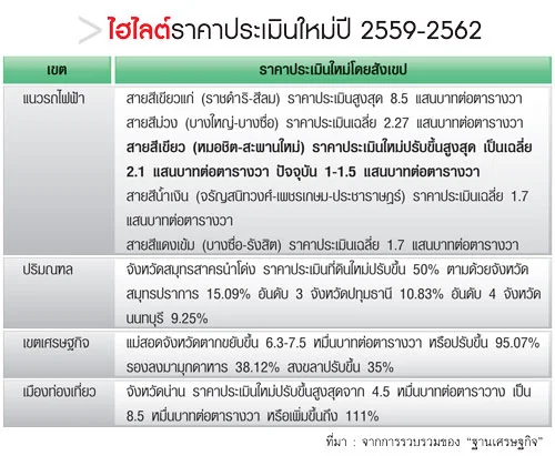 การออกมาประกาศ ราคาประเมินที่ดินใหม่สำหรับ ช่วงปี 2559-2562 ของ กรมธนารักษ์ สร้างความฮือฮาอย่างมาก โดยระบุว่าราคาประเมินที่ดินใหม่ทั่วประเทศปรับขึ้น 25% โดยเฉลี่ย ส่วนเขตกรุงเทพมหานคร ปรับขึ้นเฉลี่ย 15.75% โดยเฉพาะราคาประเมินที่ดินแนวรถไฟฟ้าที่สร้างความฮือฮามาก เนื่องจากปรับขึ้นสูงสุดถึง 75% ขณะที่ราคาประเมินที่ดินเขตปริมณฑลขยับขึ้นถ้วนหน้าเช่นกัน รวมทั้งเขตเศรษฐกิจพิเศษ ที่ราคาประเมินใหม่ปรับขึ้นอย่างก้าวกระโดดเช่นกัน