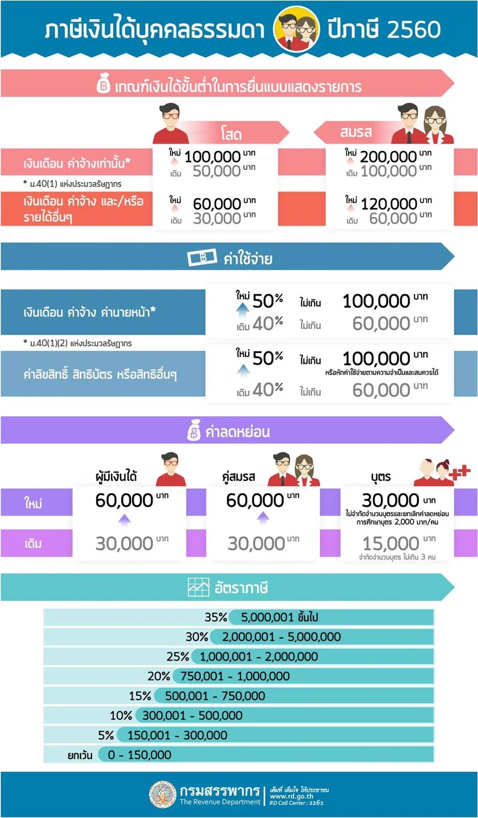 - หากผู้มีเงินได้เป็นโสด จากเดิมต้องยื่นแบบฯ เมื่อมีเงินได้เกิน 30,000 บาท เป็นต้องมีเงินได้เกิน 60,000 บาท