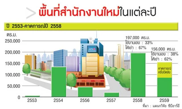 จากรายงานฉบับล่าสุดของแผนกวิจัย ซีบีอาร์อี พบว่าพื้นที่สำนักงานในกรุงเทพฯในช่วงครึ่งแรกของปี 2558 มีทั้งหมด 8.4 ล้านตร.ม. เพิ่มขึ้น 8.6 หมื่นตร.ม. ซึ่งมาจากเอไอเอ สาทร ทาวเวอร์ และ ภิรัชทาวเวอร์ แอท เอ็มควอเทียร์ คิดเป็นอัตราการใช้พื้นที่สำนักงานโดยรวมเพิ่มขึ้น 4.8% ต่อปี หรือประมาณ 1 แสนตร.ม.ในช่วงครึ่งแรกของปี 2558 ในขณะที่อัตราพื้นที่ว่างยังคงไม่มีการเปลี่ยนแปลงคงอยู่ที่ระดับ 9.7% ในส่วนของอัตราค่าเช่าพื้นที่สำนักงานยังคงเพิ่มสูงขึ้น 4-10% ต่อปี สำหรับสำนักงานในทุกเกรดและในทุกทำเล
