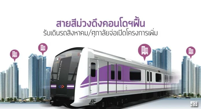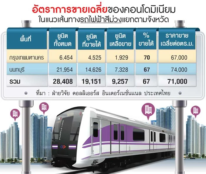 ตลาดคอนโดฯแนวรถไฟฟ้าสายสีม่วงเริ่มฟื้น รับอานิสงส์เปิดเดินรถอย่างเป็นทางการส.ค.นี้ คอลลิเออร์ส เปิดผลสำรวจพบหน่วยเหลือขายกว่า 9,257 หน่วย ขณะที่อัตราการขายอยู่ในเกณฑ์ไม่หวือหวา เหตุตลาดยังมีสินค้าอื่นให้เลือก ด้านราคาขยับขึ้นกว่า 30%ในช่วง 2-3 ปี ศุภาลัย ชี้ยอดขาย 2 เดือนที่ผ่านมาเพิ่ม 20-30% แย้มเตรียมเปิดโครงการใหม่ในพื้นที่เพิ่ม