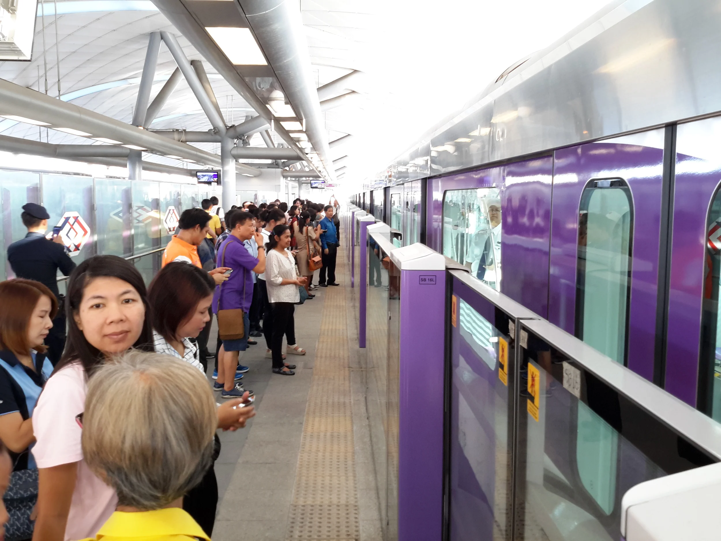 ผู้สื่อข่าวรายงานว่า เมื่อเวลา 07.00น. วันที่ 13 มิถุนายน บรรยากาศที่สถานีรถไฟฟ้าแยกนนทบุรี 1 บริเวณหน้าห้างสรรพสินค้าเซ็นทรัล สาขาถนนรัตนาธิเบศร์ ได้มีประชาชนมาต่อแถวเข้าคิวกันอย่างคึกคักเพื่อจะขึ้นทดลองนั่งใช้บริการรถไฟฟ้าสายสีม่วง ที่วิ่งผ่าน 16 สถานี ระหว่างเส้นทาง ( บางใหญ่-เตาปูน รวมระยะทาง 23 กม.) หลังทางรฟม.เปิดให้ประชาชนได้จองสิทธิ์รับตั๋วทดลองระบบในวันที่ 5 มิถุนายน ที่ผ่านมา ซึ่งได้มีประชาชนเดินทางมาลงทะเบียนรับบัตรทดสอบระบบรถไฟฟ้าสายสีม่วงกันอย่างล้นหลาม ในจุดสถานีใหญ่ต่างๆ 3 สถานี ที่เปิดให้บริการลงทะเบียนได้แก่ 1.สถานีคลองบางไผ่ (หน้าห้างสรรพสินค้าเซ็นทรัลเวสต์เกต อ.บางใหญ่) 2.สถานีแยกนนทบุรี 1 (สถานีหน้าห้างสรรพสินค้าเซ็นทรัล ถ.รัตนาธิเบศร์) และ 3.สถานีเตาปูน ซึ่งการลงทะเบียนจองสิทธิ์ดังกล่าวสามารถทดลองระบบเดินทางนั่งบนรถไฟฟ้าสายสีม่วงได้จริงในวันที่ 13 15 17 ในเดือนมิถุนายนนี้ เริ่มเวลา 07.00 น.- 09.00 น. และ ตั๋ว 1ใบ ใช้เดินทางได้ 2 ท่าน