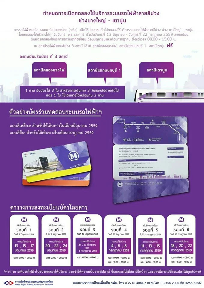 การรับบัตรทดลองโดยสารรถไฟฟ้าสายสีม่วงช่วง บางใหญ่ - เตาปูน ..แจกบัตรทุกๆวันอาทิตย์ของเดือนมิ.ย. และ ก.ค. เวลา 9.00 - 15.00 น.