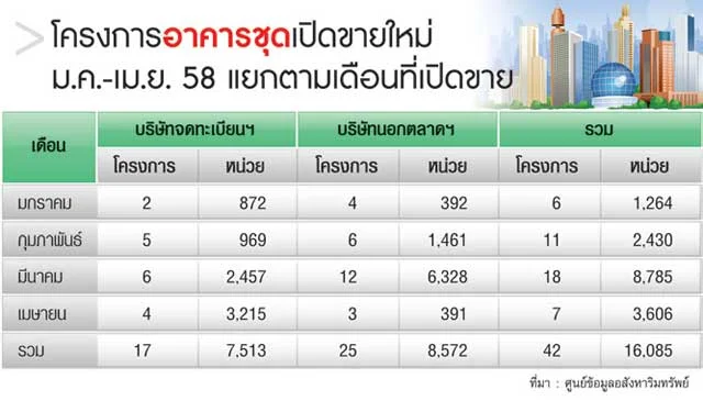 จากการสำรวจของศูนย์ข้อมูลอสังหาริมทรัพย์ พบว่า ในช่วง 4 เดือนแรก (ม.ค.-เม.ย.58) มีโครงการอาคารชุดเปิดตัวใหม่รวมทั้งสิ้น 42 โครงการ รวม 16,085 หน่วย แบ่งเป็นโครงการที่พัฒนาโดยผู้ประกอบการที่จดทะเบียนในตลาดหลักทรัพย์ฯ 17 โครงการ จำนวน 7,513 หน่วย และโครงการที่พัฒนาโดยผู้ประกอบการนอกตลาดฯ 25 โครงการ จำนวน 8,572 หน่วย ซึ่งกรุงเทพฯยังคงเป็นพื้นที่ที่ได้รับความนิยมในการพัฒนาโครงการ โดยในช่วง 4 เดือนที่ผ่านมา มีผู้ประกอบการนอกตลาดฯพัฒนาโครงการในกรุงเทพฯมากถึง 19 โครงการ จำนวน 6,072 หน่วย ในขณะที่ผู้ประกอบการในตลาดฯพัฒนาเพียง 10 โครงการ จำนวน 3,740 หน่วยเท่านั้น