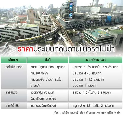 จุดที่เห็นได้ชัดคือในเส้นทางรถไฟฟ้าบีทีเอสให้บริการ ราคาที่ดินปรับเพิ่มขึ้นสูงมาก ตั้งแต่แนวถนนพหลโยธิน ถนนสุขุมวิทไปจนถึงฝั่งธนบุรี ราคาตั้งแต่หลักแสนไปจนถึงหลักล้านบาทต่อตารางวา โดยเฉพาะย่านปทุมวัน สยาม ที่ยังคงราคาหลักล้านบาทติดต่อกันมานาน 2-3 ปีแล้ว ส่วนพื้นที่พระราม 9 อโศก พระราม 4 ก็ไล่จี้ติดกันมา บางทำเลราคาสูงกว่า 6 แสนบาทต่อตารางวาไปแล้ว โดยเฉพาะทำเลมักกะสัน –อโศก สำหรับราคาเกาะแนวรถไฟฟ้าแอร์พอร์ตลิงค์ยังพบว่าไม่มีการปรับราคามากนัก ส่วนใหญ่ยังอยู่ในระดับ 1-3 แสนบาท