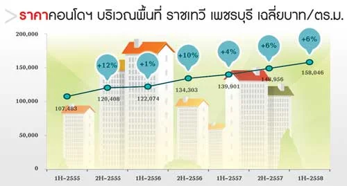 สำหรับราคาคอนโดมิเนียมในบริเวณนี้ถือว่าเติบโตอย่างต่อเนื่อง สะท้อนความต้องการที่เพิ่มขึ้น โดยล่าสุดในช่วงครึ่งปีแรกที่ผ่านมา พบว่า ราคาเสนอขายปรับตัวสูงขึ้นแล้ว 6% จากปลายปี 2557 มาที่ 158,046 บาทต่อตร.ม. ซึ่งในช่วง 3 ปีที่ผ่านมา พบว่า ราคาขายเฉลี่ยเติบโตสูงถึง 47% แต่ถ้าดูเฉพาะโครงการอาคารสูงแล้วราคาจะสูงกว่านี้มาก โดยในปีที่แล้วมีโครงการเปิดตัว 2 โครงการ ที่มีราคาขายเฉลี่ยอยู่ที่ 1.75 แสนบาทต่อตร.ม. ซึ่งขายใกล้จะหมด นอกจากนี้ราคาขายต่อของโครงการระดับ High End ก็ขยับตัวไปอยู่ที่กว่า 2.50 แสนบาทต่อตร.ม. เพิ่ม 80% จากช่วงเปิดตัวเมื่อ 6 ปีที่แล้ว จึงคาดได้ว่าถ้ามีโครงการใหม่ออกมาเสนอขายในบริเวณนี้ราคาจะไม่ต่ำกว่า 2 แสนบาทต่อตร.ม.