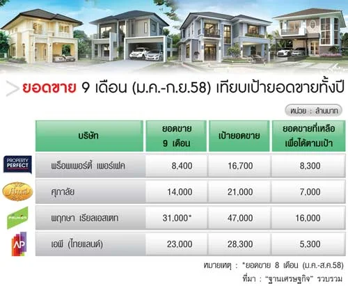 บิ๊กเนมอสังหาฯ เปิดยอดขาย 9 เดือน พร้อมแผนรุกตลาดไตรมาส 4 ลั่นแข่งขันรุนแรงแน่นอน พร็อพเพอร์ตี้ เพอร์เฟค-ศุภาลัย เผยต่ำเป้า คาดกระทบเป้ายอดขายรวมปี 58 เหตุมาตรการกระตุ้นภาครัฐไม่ชัดเจน เศรษฐกิจไม่เอื้อเติบโต ด้านพฤกษา-เอพี ยันยอดขาย-รายได้ปี 58 เป็นไปตามเป้าแน่นอน แม้ปรับลดการพัฒนาโครงการใหม่