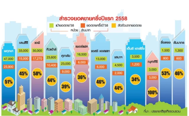 ผู้สื่อข่าวสำรวจยอดขายครึ่งปีแรก 2558 บริษัทอสังหาริมทรัพย์ ทั้งผู้ประกอบการรายใหญ่ รายกลาง และผู้ประกอบการนอกตลาดหลักทรัพย์ฯ อาทิ ค่ายพฤกษาฯ, เอพี (ไทยแลนด์), ศุภาลัย, ณุศาศิริ, เอ็น.ซี. เฮ้าส์ซิ่ง, เสนาดีเวลลอปเม้นท์, สัมมากร, ซื่อตรง กรุ๊ป ฯลฯ (ดูกราฟิกประกอบ) พบว่า มีเพียง 4 รายที่ทำยอดขายครึ่งปีเกิน 50% จากเป้ายอดขายรวมทั้งปี ที่เหลือมีผลประกอบการลดหลั่นกันลงมา