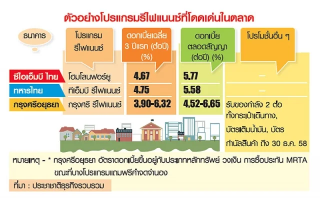 อย่างไรก็ตาม ที่ผ่านมา ธนาคารได้ออกโปรแกรมรีไฟแนนซ์ สินเชื่อบ้านโฮมโลนฟอร์ยู (Balance Transfer Refinance Program) ให้อัตราดอกเบี้ยพิเศษเฉลี่ย 3 ปีแรก 4.67% ต่อปี จากปกติจะอยู่ที่ 6-7% ขณะที่อัตราดอกเบี้ยตลอดอายุสัญญาที่ 5.77% ต่อปี ซึ่งธนาคารได้เตรียมวงเงินให้โปรแกรมนี้รวม 2,000 ล้านบาท แต่ช่วงที่ผ่านมายอดรีไฟแนนซ์ไม่ได้สูงมากนัก โดยปัจจุบันมีลูกค้ารีไฟแนนซ์เข้ามาประมาณ 5-10% ของสินเชื่อใหม่