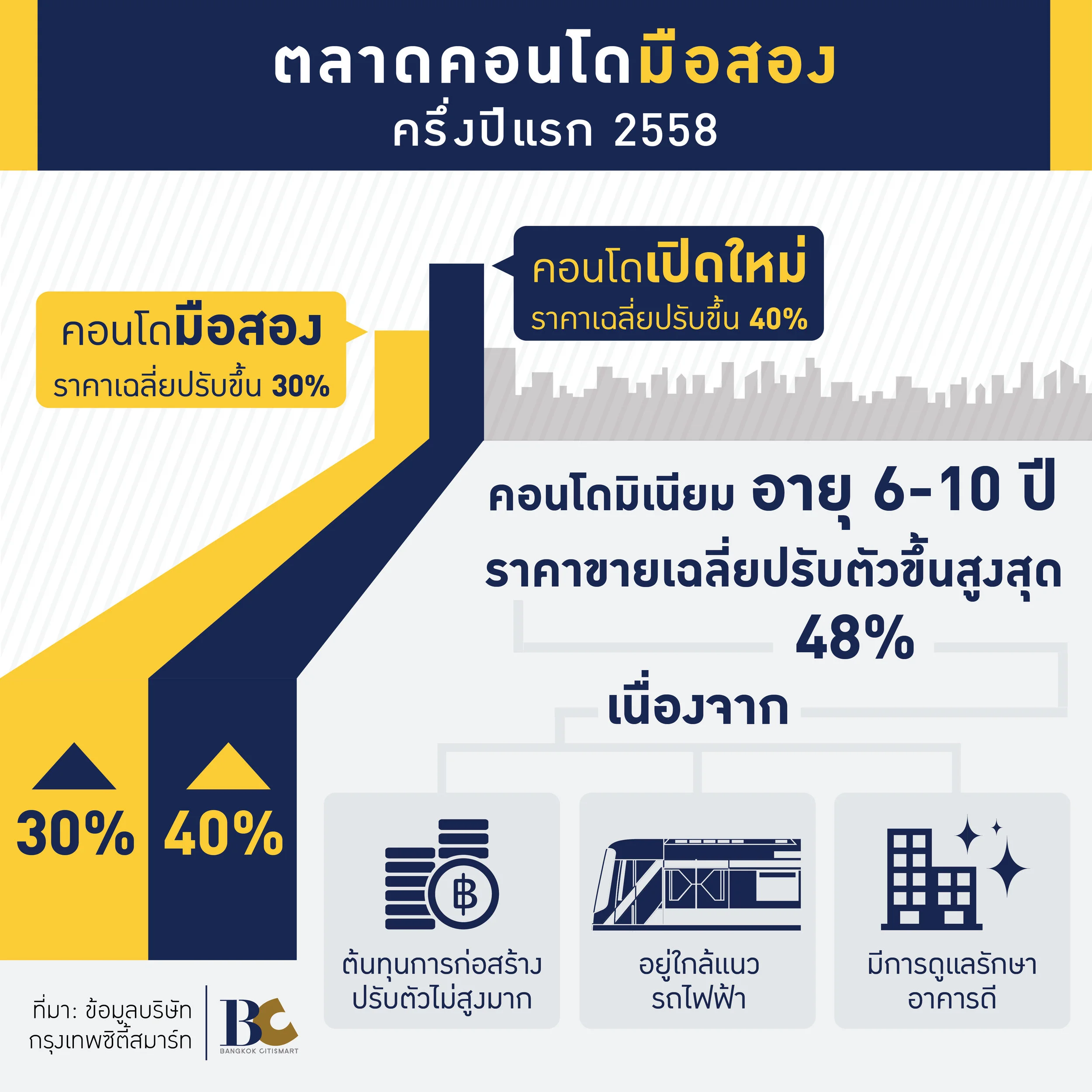 กรุงเทพ ซิตี้สมาร์ท เผยตลาดคอนโดมิเนียมมือสองช่วงครึ่งปีแรกปี 2558 เติบโตได้ดี สะท้อนกำลังซื้อของผู้บริโภคที่มีอย่างต่อเนื่อง มีการปรับขึ้นของราคาขายเฉลี่ยมากถึงร้อยละ 30 แต่ยังคงต่ำกว่าราคาซื้อขายคอนโดมิเนียมเปิดใหม่ที่ปรับขึ้นร้อยละ 40 โดยคอนโดมิเนียมที่มีอายุ 6-10 ปี มีอัตราการปรับตัวของราคาเฉลี่ยดีที่สุด จากต้นทุนการก่อสร้างเดิมที่ไม่สูงมากเท่าปัจจุบัน พบคอนโดมิเนียมโซนพญาไท ราชเทวี อนุเสาวรีย์ มีราคาขายเฉลี่ยสูงสุด คาดครึ่งปีหลังยังคงเติบโตได้ดี จากความต้องการคอนโดมิเนียมมือสองที่มีอยู่อย่างต่อเนื่อง โดยเฉพาะโซนในเมืองที่มีพื้นที่ในการพัฒนาที่ค่อนข้างจำกัด