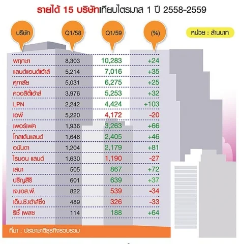 โดย 5 บริษัท มีรายได้สูงสุดในไตรมาส 1/59 ได้แก่ บมจ.พฤกษา เรียลเอสเตท ทำรายได้ 10,283 ล้านบาท เติบโต 24%, บมจ.แลนด์ แอนด์ เฮ้าส์ มีรายได้ 7,016 ล้านบาท เติบโต 35%, บมจ.ศุภาลัย รายได้ 6,275 ล้านบาท เติบโต 25%, บมจ.ควอลิตี้เฮ้าส์ รายได้ 5,253 ล้านบาท โต 32% และ บมจ.แอล.พี.เอ็น. ดีเวลลอปเมนท์ รายได้ 4,424 ล้านบาท เติบโต103%