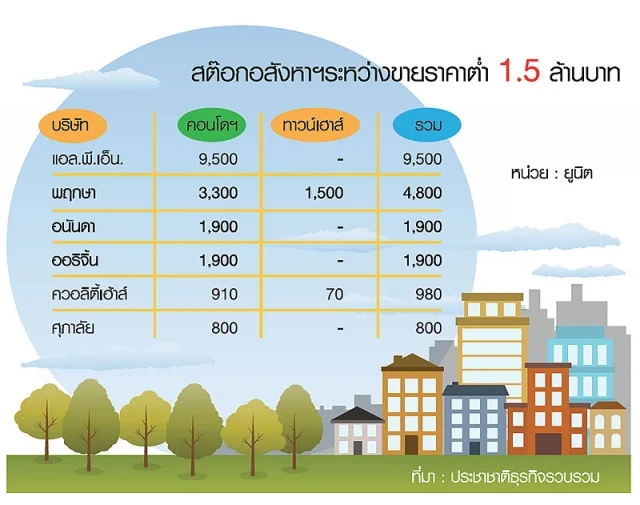 ผู้สื่อข่าว "ประชาชาติธุรกิจ" สำรวจข้อมูลผู้ประกอบการ 6 บริษัท ที่คาดว่ามีสต๊อกอสังหาฯราคาไม่เกิน 1.5 ล้านบาทตามนโยบายบ้านประชารัฐ ได้แก่ บมจ.แอล.พี.เอ็น.ดีเวลลอปเมนท์ หรือ LPN, บมจ.พฤกษา เรียลเอสเตท, บมจ.อนันดา ดีเวลลอปเม้นท์, บมจ.ออริจิ้น พร็อพเพอร์ตี้, บมจ.ควอลิตี้เฮ้าส์ และ บมจ.ศุภาลัย พบว่า มีที่อยู่อาศัยตามเกณฑ์รวมกว่า 19,880 ยูนิต