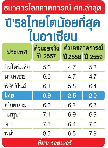 แต่เพิ่งเริ่มต้นลุยมาตรการกระตุ้นเศรษฐกิจไปได้ไม่เท่าไหร่รายงานจากธนาคารโลกหรือเวิร์ลด์แบงก์ก็คาดการณ์ออกมาเป็นผลเชิงลบต่อโอกาสในการเติบโตทางเศรษฐกิจของประเทศไทยอีกครั้งหนึ่ง นั่นคือนอกจากตัวเลขอัตราการเติบโตทางเศรษฐกิจของไทยปี2557ที่ต่ำสุดในกลุ่มประเทศอาเซียน (0.9%) แล้ว ธนาคารโลกยังมองไปข้างหน้าอีกว่า ในปี 2558 และ 2559 อัตราการเติบโตทางเศรษฐกิจของประเทศไทยน่าจะกระเตื้องขึ้นมาอยู่ที่ระดับ 2.5% และ 2%