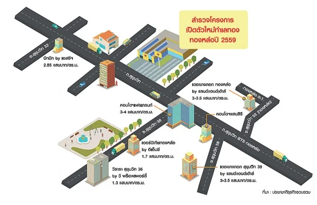 ด้านจำนวนยูนิตโครงการแนวสูงเปิดใหม่ ปี 2558 ทำเลสุขุมวิทชั้นใน ตั้งแต่เพลินจิตจนถึงทองหล่อ มีเปิดใหม่กว่า 4,000 ยูนิต อัตราดูดซับประมาณ 80% ในจำนวนนี้เฉพาะบริเวณสถานีทองหล่อมีประมาณ 1,200 ยูนิต และคาดว่าปี 2559 จะมีโครงการเปิดใหม่จำนวนยูนิตใกล้เคียงเดิม