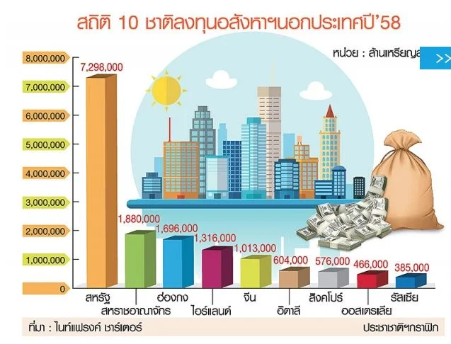 โดยสหรัฐยังเป็นชาติที่มีการลงทุนอสังหาฯนอกประเทศสูงสุด ปี 2558 ชาวอเมริกันมีการลงทุนไปกว่า 7.3 ล้านล้านเหรียญสหรัฐ