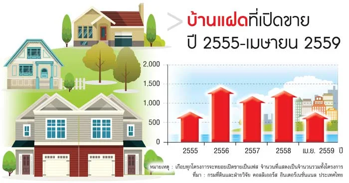 ทั้งนี้ จากการรวบรวมข้อมูลเกี่ยวกับบ้านแฝด พบว่า มีจำนวนรวมของบ้านแฝดที่เปิดขายมาตั้งแต่ปี 2550 -เมษายน 2559 อยู่ที่ประมาณ 14,796 หน่วย ขายไปได้แล้วประมาณ 76% มีเหลือขายอยู่ไม่มากคือประมาณ 3,500 หน่วย โดยส่วนใหญ่จะมีราคาขายอยู่ที่ประมาณกว่า 3 ล้านบาทต่อหน่วย โดยสัดส่วนที่มากที่สุดจะอยู่ที่ประมาณ 3 – 5 ล้านบาทต่อหน่วย หรือคิดเป็นสัดส่วนที่ 65%