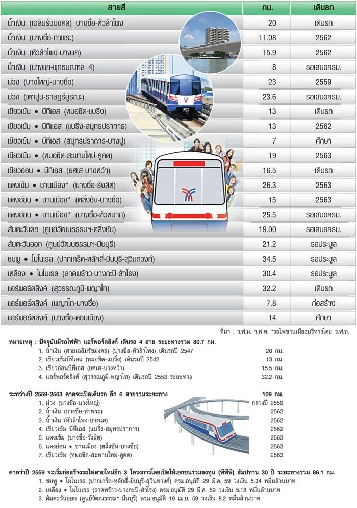 สำหรับโครงการที่อยู่ระหว่างก่อสร้าง หากไม่มีอะไรคาดเคลื่อนอีก 5 ปีต่อจากนี้ (2559-2563) คนกรุงเทพฯ และจังหวัดข้างเคียง จะมีรถไฟฟ้า ใต้ดิน บนดิน และรถไฟชานเมือง เพิ่มขึ้นอีก 8 สาย เริ่มจาก ไฮไลต์ปีนี้คือ สายสีม่วง (บางซื่อ-บางใหญ่) ที่ อาคม เติมพิทยาไพสิฐ รัฐมนตรีว่าการกระทรวงคมนาคม ยืนยัน สิงหาคม นี้เดินรถแน่ คิวถัดไป คือ สายสีน้ำเงิน ช่วง บางซื่อ-ท่าพระ กับ หัวลำโพง บางแค (ดูตารางประกอบ) ส่วน รถไฟชานเมืองสายสีแดงอ่อน (ตลิ่งชัน – บางซื่อ) แม้สร้างเสร็จแล้ว(กำหนดเดิมเดินรถปี2559) แต่เนื่องจากใช้สถานเดียวกับ สายสีแดงเข้ม (บางซื่อ-รังสิต) จึงต้องรอไปถึงปี 2563 โดยประมาณจึงจะเดินรถเต็มรูปแบบได้