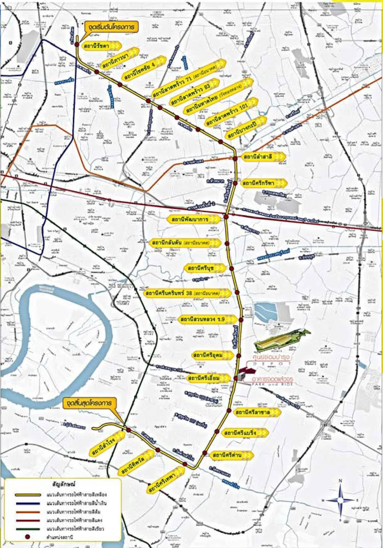 สำหรับเส้นทางโครงการรถไฟฟ้าสายสีเหลือง ช่วงลาดพร้าว-สำโรง มีทั้งหมด 23 สถานี ได้แก่